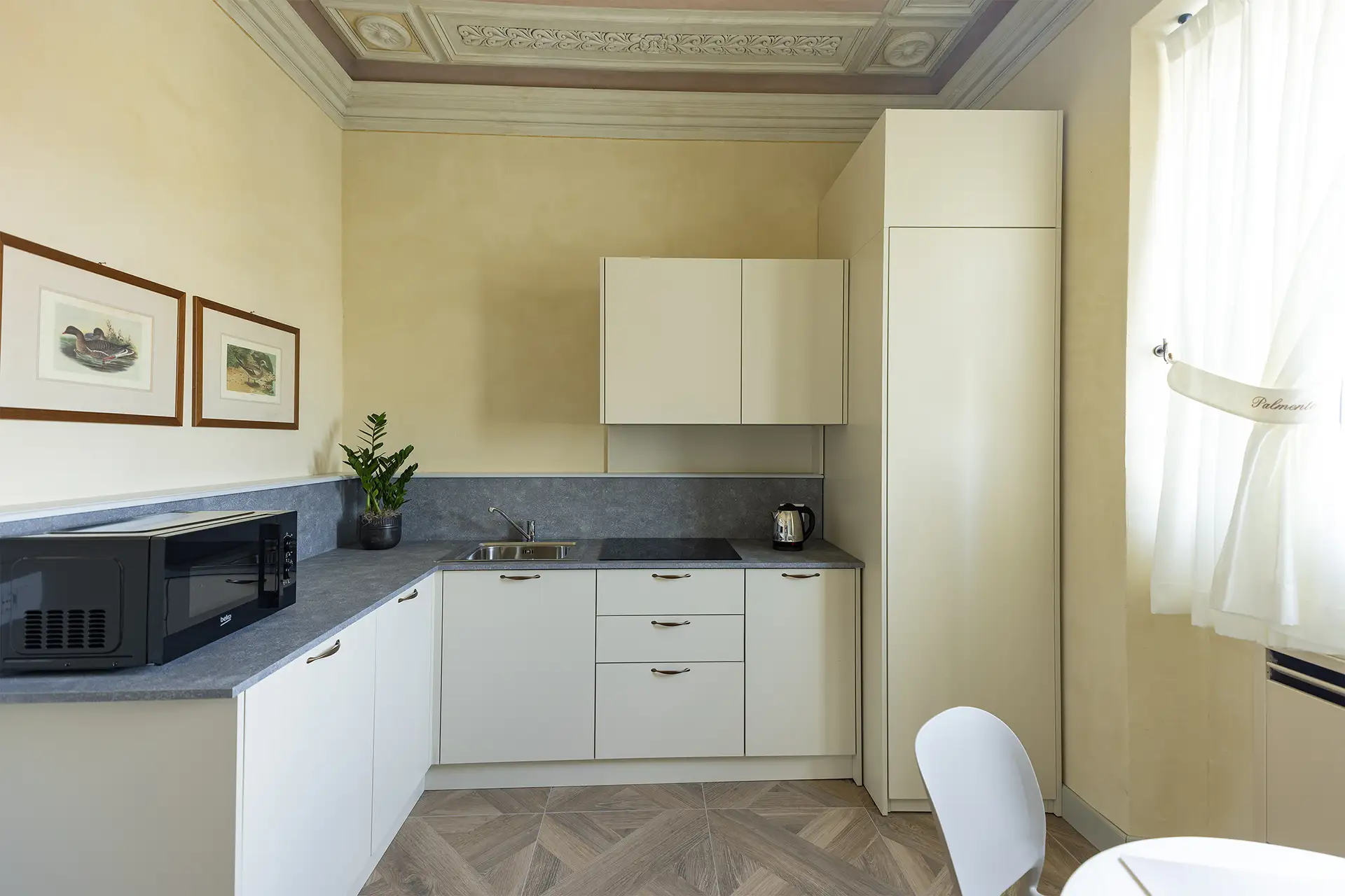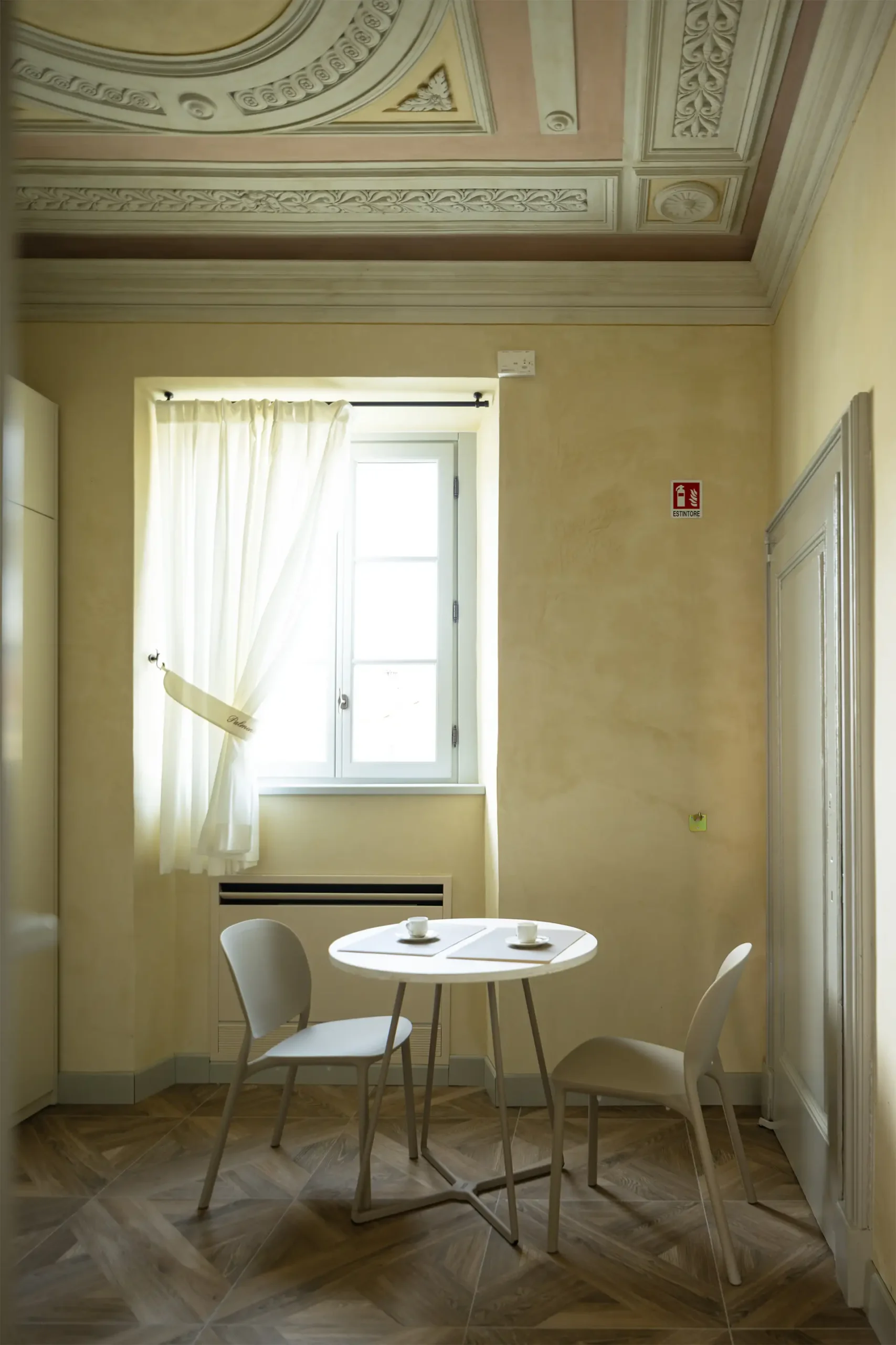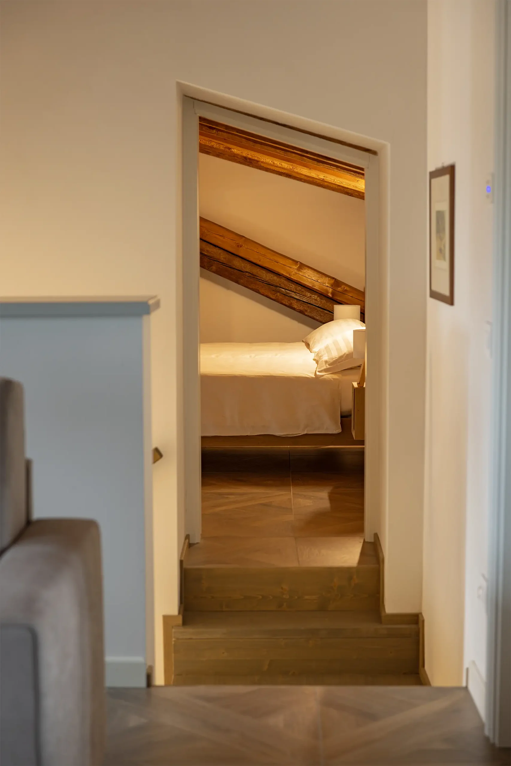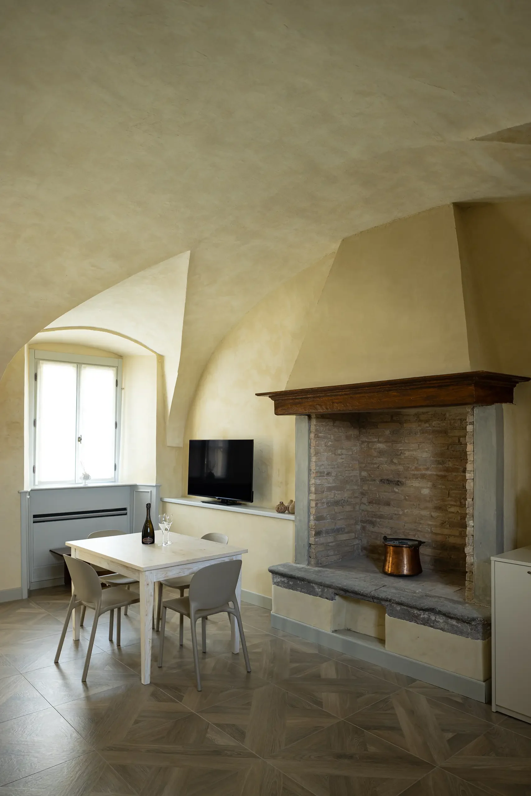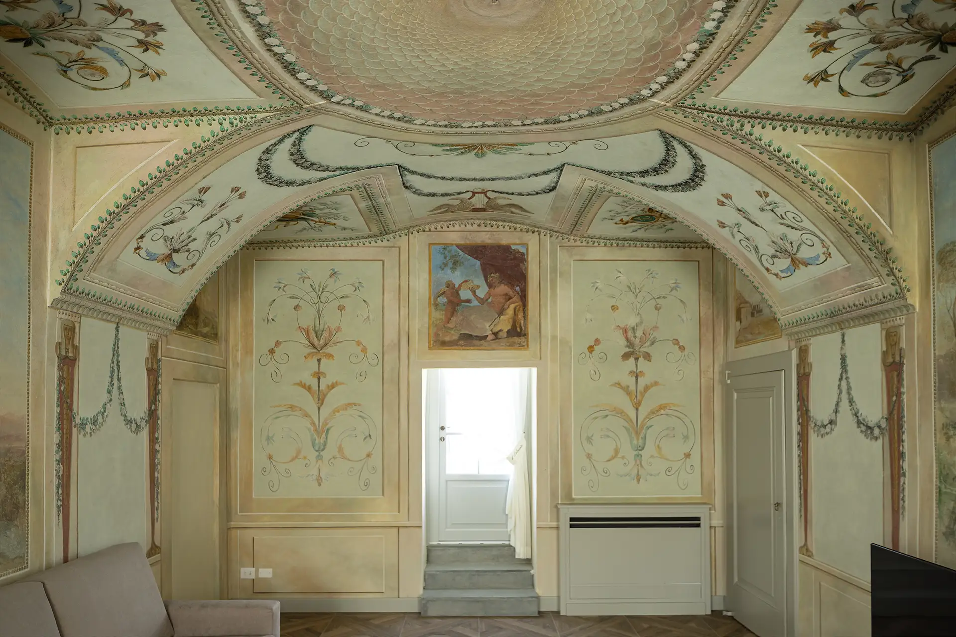 All’interno, alcune sale conservano tracce decorative ottocentesche, con motivi floreali e paesaggi, che restituiscono il sapore di una dimora vissuta e stratificata nel tempo. Un’ospitalità che unisce il fascino dell’architettura storica al comfort di appartamenti raffinati.