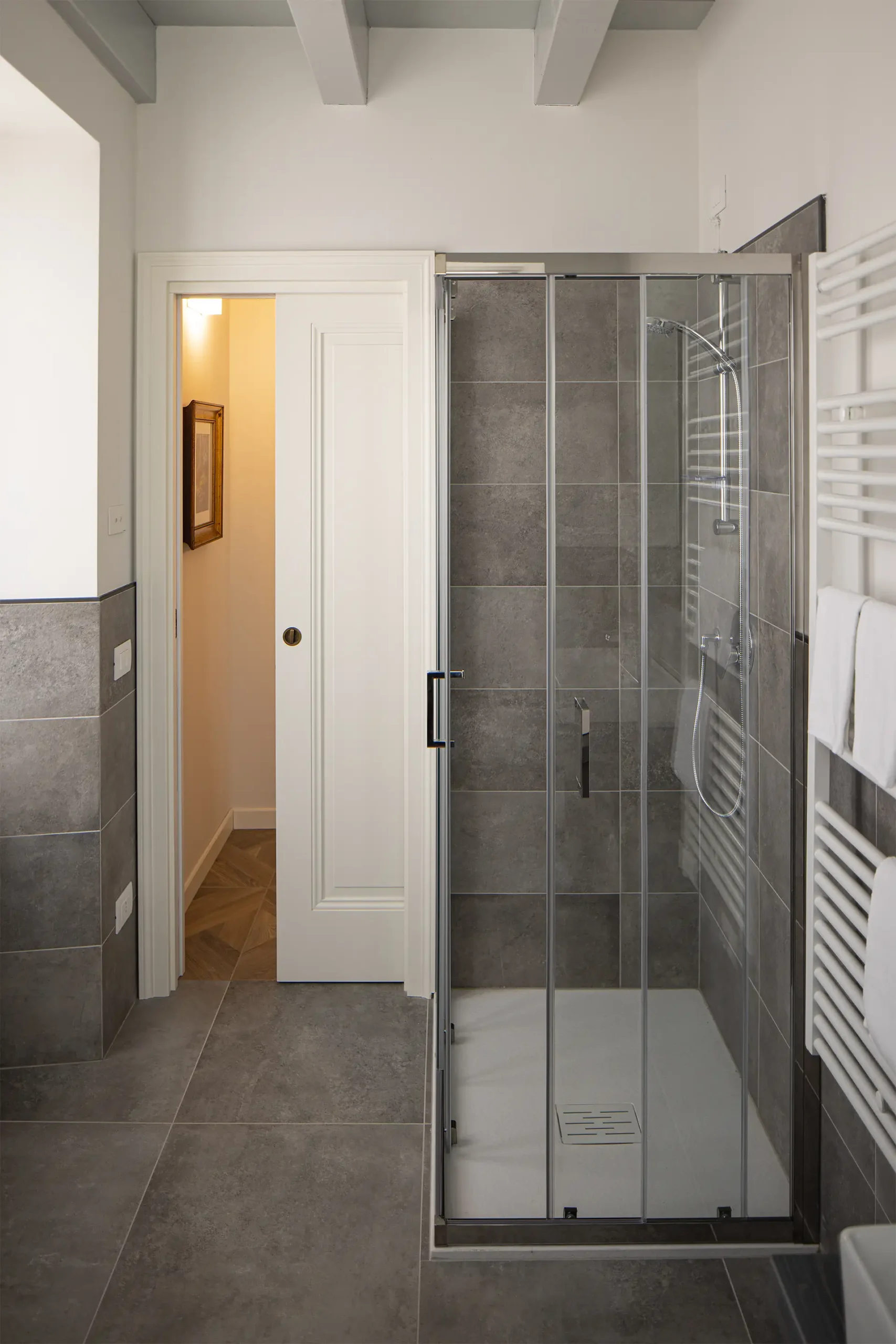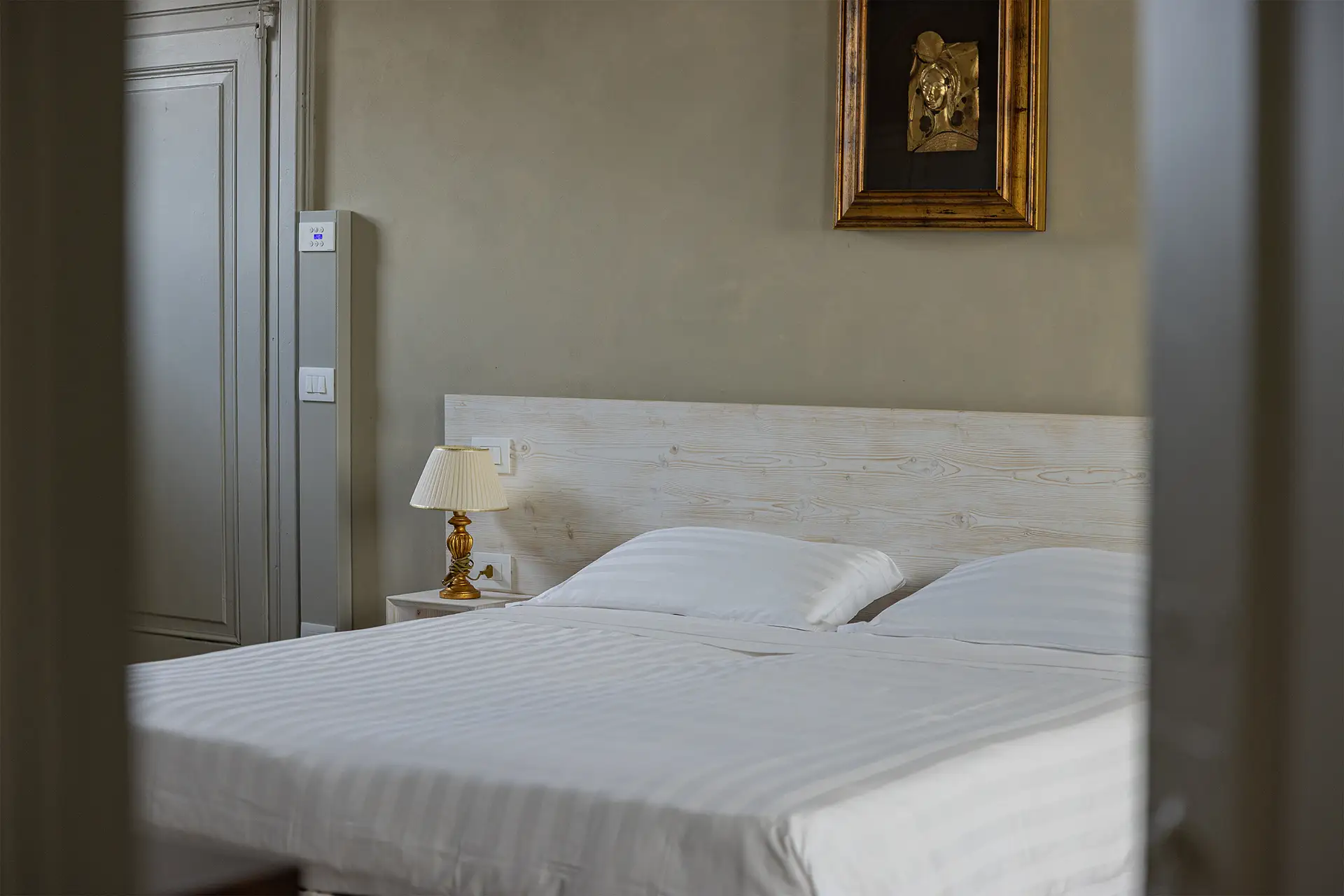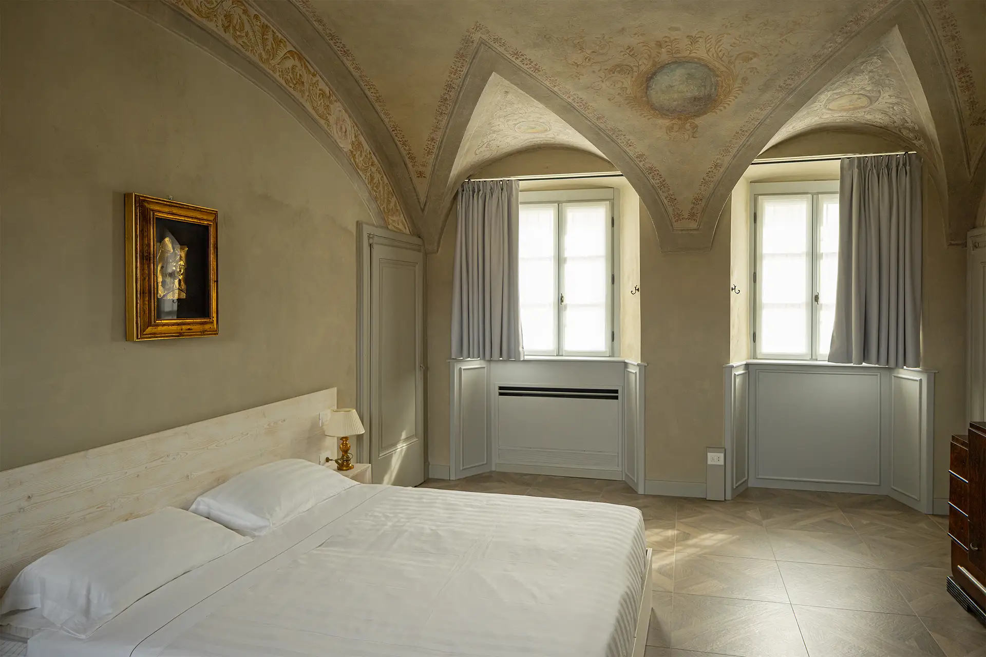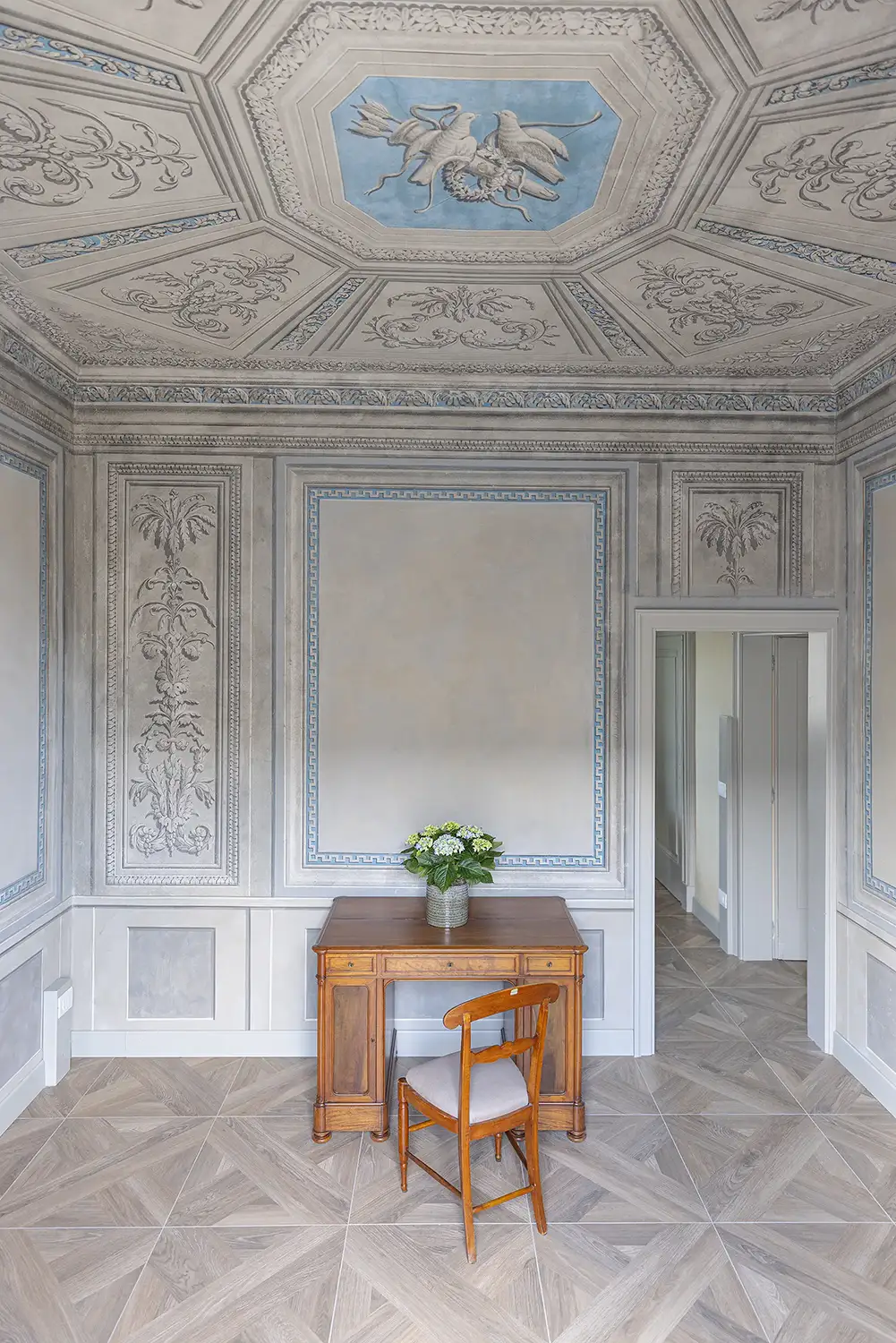 All’interno, alcune sale conservano tracce decorative ottocentesche, con motivi floreali e paesaggi, che restituiscono il sapore di una dimora vissuta e stratificata nel tempo. Un’ospitalità che unisce il fascino dell’architettura storica al comfort di appartamenti raffinati.