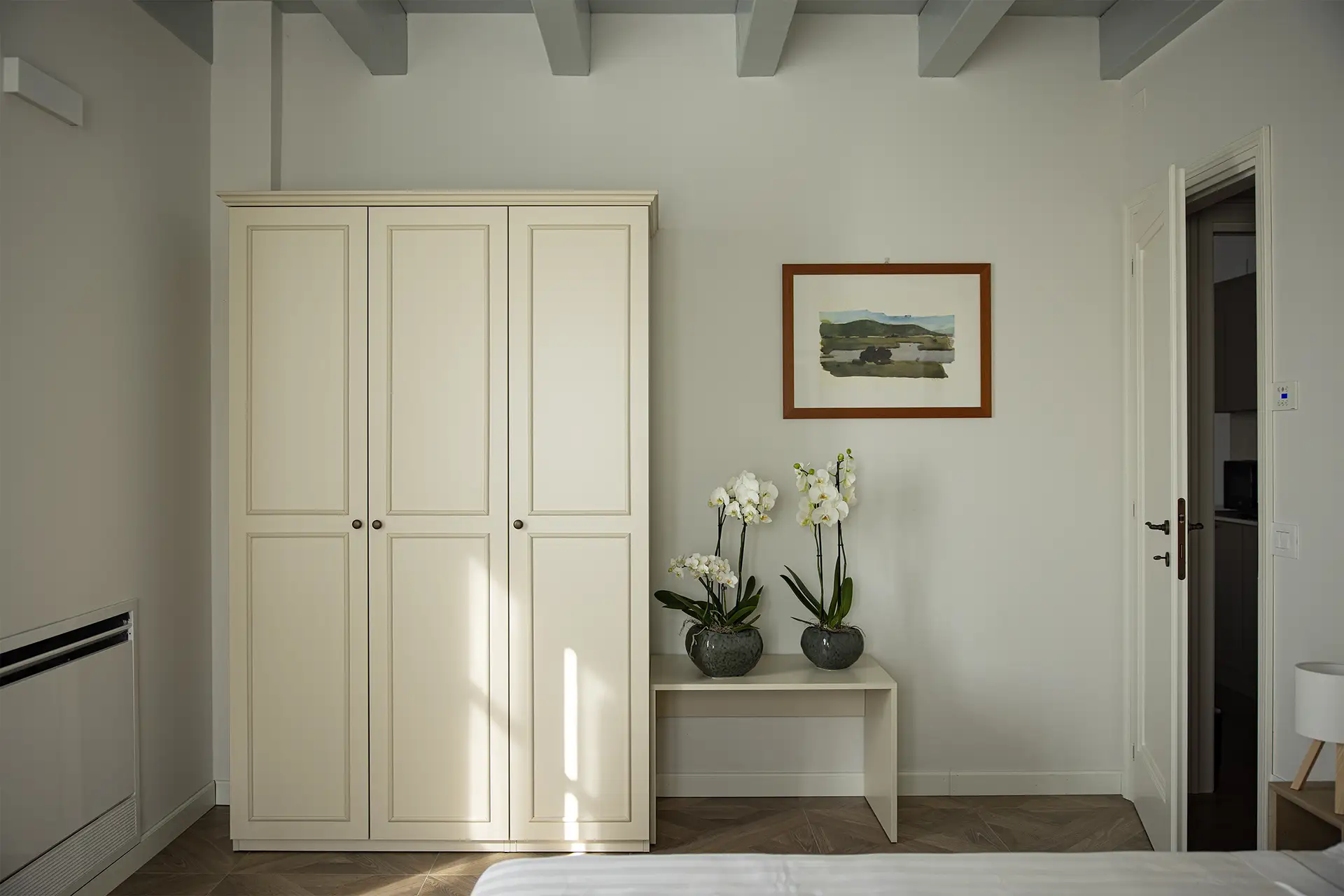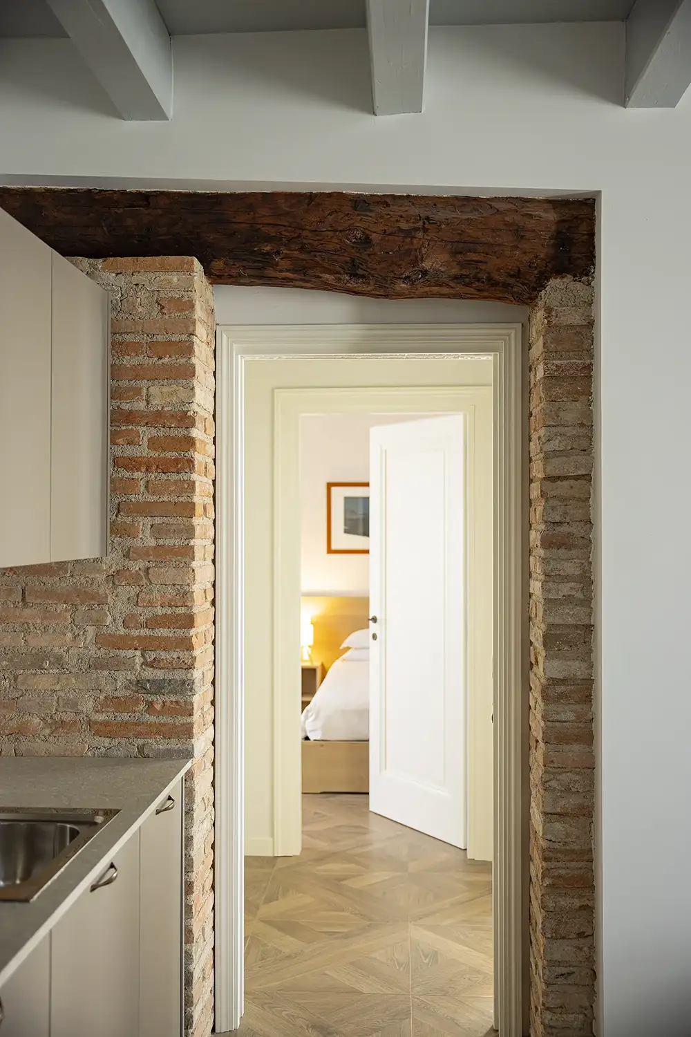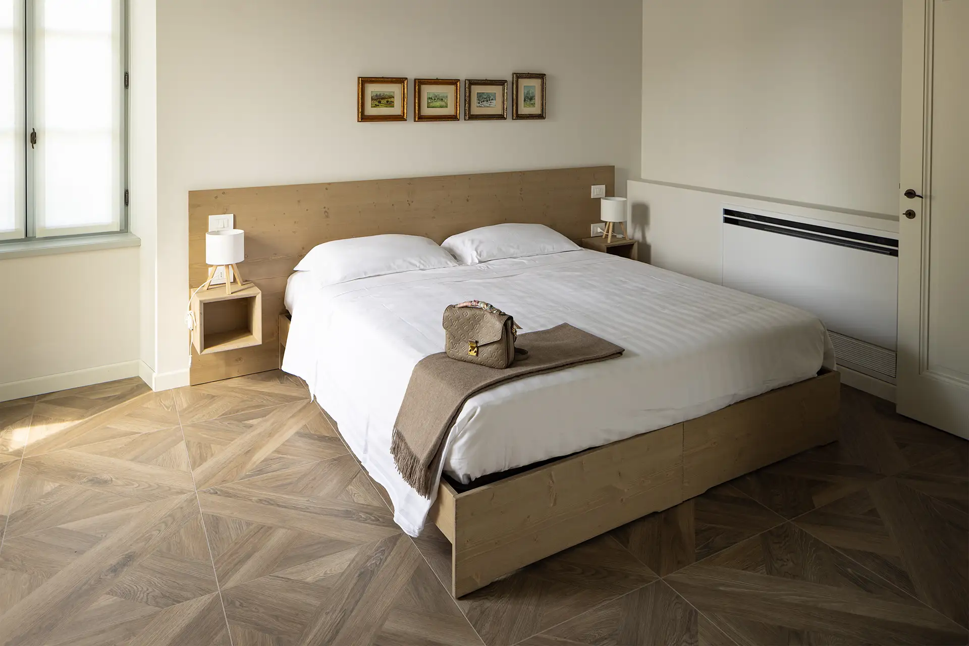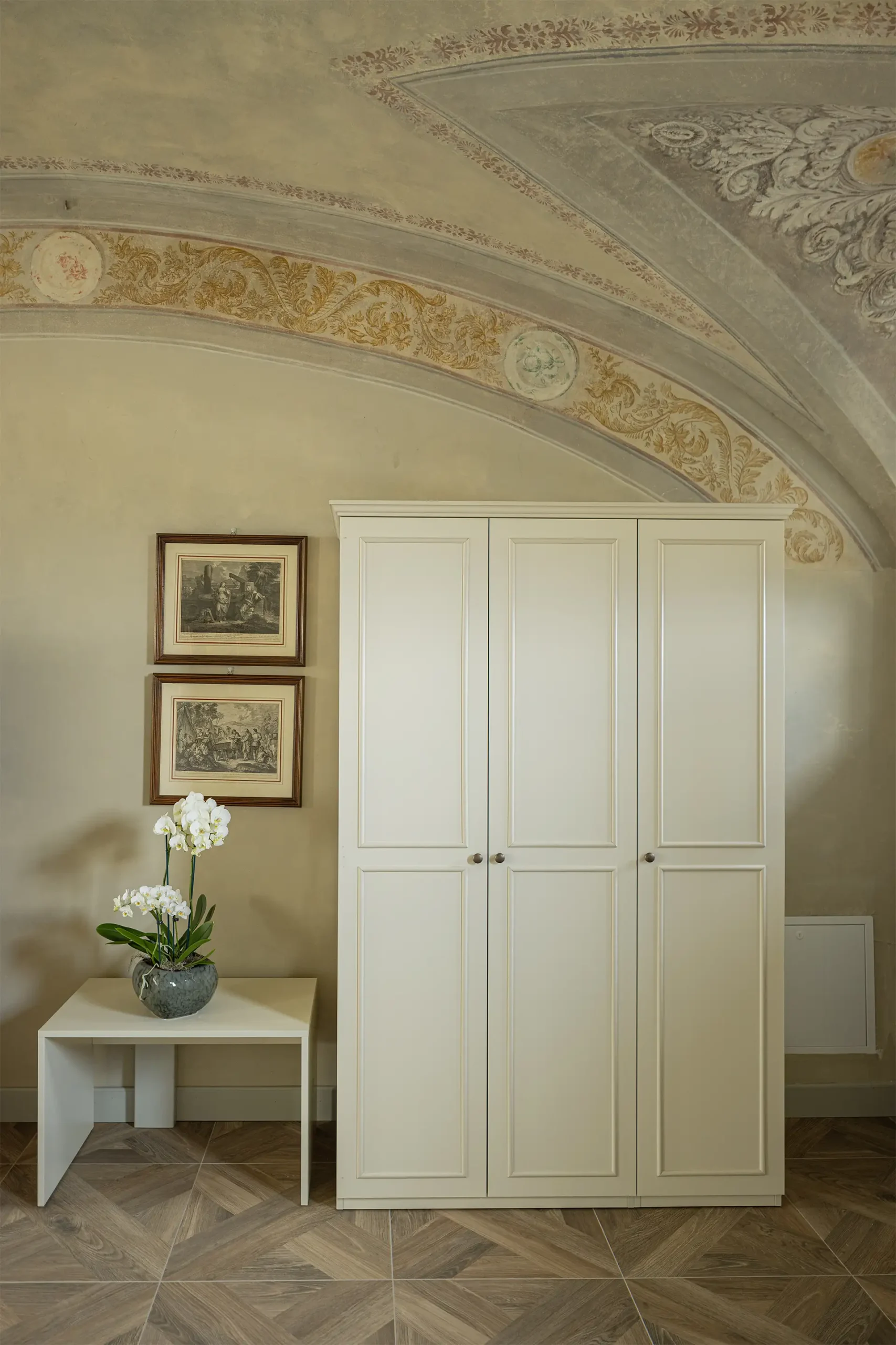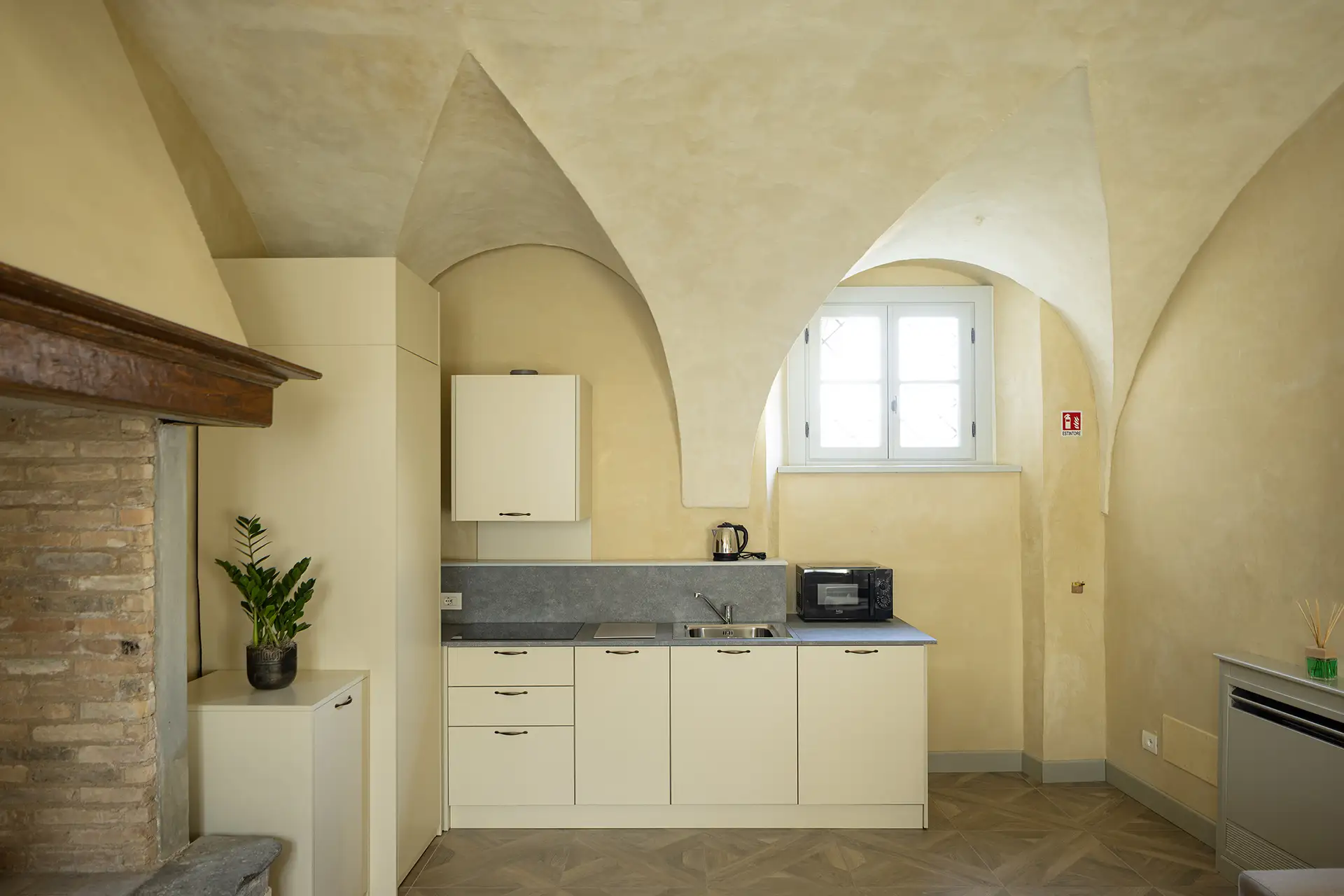 All’interno, alcune sale conservano tracce decorative ottocentesche, con motivi floreali e paesaggi, che restituiscono il sapore di una dimora vissuta e stratificata nel tempo. Un’ospitalità che unisce il fascino dell’architettura storica al comfort di appartamenti raffinati.